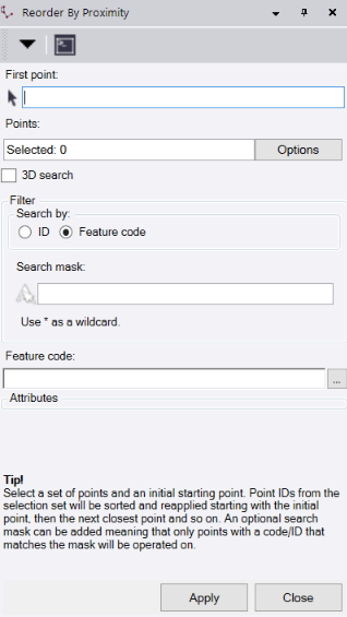 The Reorder by Proximity command allows the user to reorder the point IDs based on the shortest distance to the next point. After selecting the first point in the string the programme automatically reorders the point numbers based on the next nearest point. This can be filtered by search masks on the feature code or point ID’s.