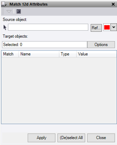 - Click in the Target objects field and then in a graphic view select the data you want to match the 12d attributes onto. Click Options button for additional selection options.