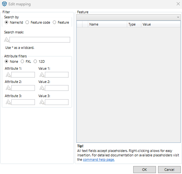 Once the feature is selected the attributes associated with it will be displayed and values can be added. If the value is left empty and the targeted object already has this same feature and a value set, then it will not be changed. You can also use any Placeholders shown below in the value column.
