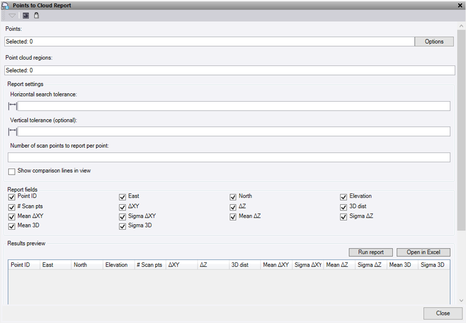 The Points to Cloud Report command compares points to a point cloud region or scan to determine the nearest scan point to the selected point and provides a comparison between the derived point pairs. This is a useful tool to compare measured ground check points with computed point clouds from drone surveys and slam scans.
