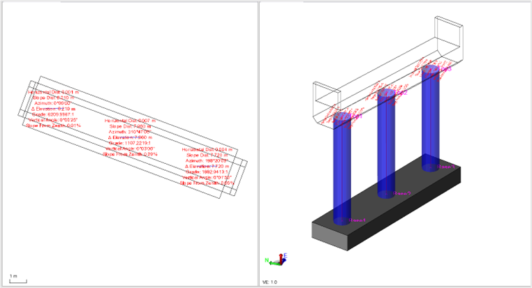 ジオメトリの測定コマンドを使用すると、ラインやポイントをベースとして選択した上で、ポイント/ノードを選択し、測点距離・オフセット・高度差・勾配・方位角・鉛直角・天頂からの傾斜・距離などのさまざまな測定値を計算することができます。結果をテキストレイヤーに注釈として追加したり、エクセルレポートを作成したりすることができます。